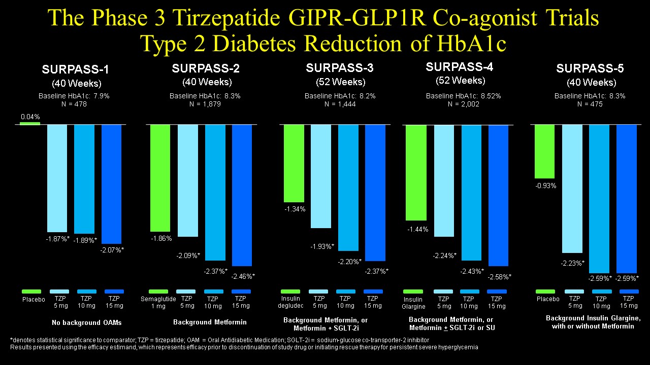 Although several GIP-GLP-1 co-agonists initially failed to impress in clinical testing, more recent data for trizepatide (originally known as LY3298176) demonstrated compelling reduction of blood glucose and body weight in both preclinical LY3298176, a novel dual GIP and GLP-1 receptor agonist for the treatment of type 2 diabetes mellitus: From discovery to clinical proof of concept Mol Metab. 2018 Dec;18:3-14. doi: 10.1016/j.molmet.2018.09.009 and clinical studies. Tirzepatide (LY3298176) is a 39 amino acid peptide based on a GIP sequence modified to include substitution of the second amino acid with aminoisobutyric acid (DPP-4 resistance) and containing a C20 unsaturated di-acid acyl chain, to enable non-covalent albumin binding and once-weekly subcutaneous dosing LY3298176, a novel dual GIP and GLP-1 receptor agonist for the treatment of type 2 diabetes mellitus: From discovery to clinical proof of concept Mol Metab. 2018 Dec;18:3-14. doi: 10.1016/j.molmet.2018.09.009 Tirzepatide exhibits comparable binding affinity and potency at the human GIPR relative to native GIP yet binds with 5-fold less affinity and is 13-fold less potent at the human GLP-1R, compared to native GLP-1 thus exhibiting bias for the GIPR. Several of the key dose rangong studies and clinical trials are highlighted here Efficacy and safety of LY3298176, a novel dual GIP and GLP-1 receptor agonist, in patients with type 2 diabetes: a randomised, placebo-controlled and active comparator-controlled phase 2 trial Lancet. 2018 Nov 17;392(10160):2180-2193. An overview of the Phase 3 Tirzepatide SURPASS program for Type 2 diabetes was presented by Eli Lilly on Nov 20 2020 and the SURPASS trials have been published highlighting the efficacy of Tirzepatide in people with T2D. The SURPASS phase 3 clinical trial program assessed the efficacy of Tirzepatide in people with type 2 diabetes. The results are summarized below, for HbA1c and weight loss