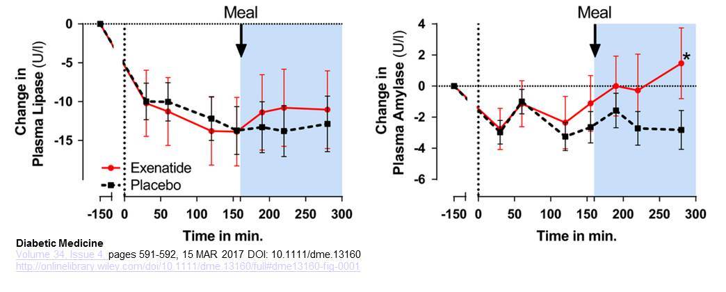 Smits et al examined the profiles of plasma amylase and lipase after acute infusion of exenatide (50 ng/min in 30 min, followed by continuous infusion of 25 ng/min) in human subjects with type 2 diabetes, studied both in the fasting state and following consumption of a meal. Plasma levels of amylase were significantly higher after exenatide, whereas plasma levels of lipase trended higher but were not significantly different within the 280 minute study period. Acute plasma amylase increase after glucagon-like peptide -1 receptor agonist exenatide administration in Type 2 diabetes Diabet Med. 2017 Apr;34(4):591-592