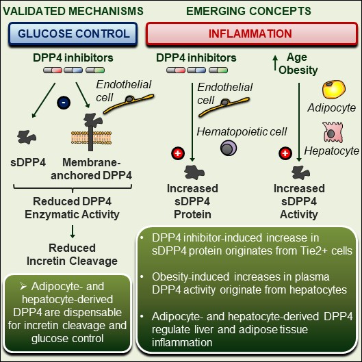 Ghorpade et al identified, soluble DPP4 originating from hepatocytes as an important modulator, together with factor Xa, acting through caveolin 1 and PAR2, of adipocyte macrophage inflammation, insulin sensitivity and glucose homeostasis in high fat diet-fed mice. Hepatocyte-secreted DPP4 in obesity promotes adipose inflammation and insulin resistance Nature. 2018 Mar 29;555(7698):673-677