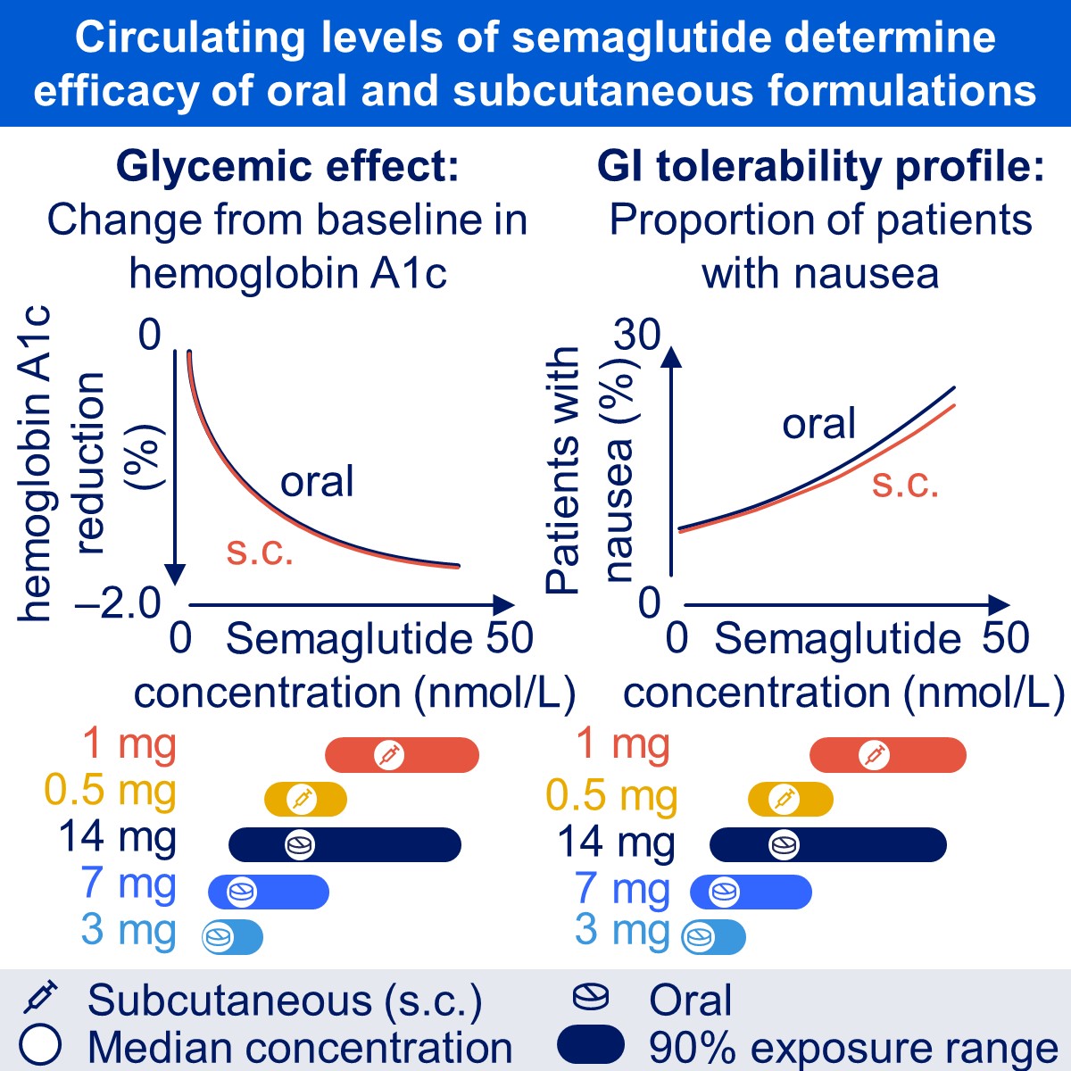 Overgaard, R.V., .Hertz, C. L., Ingwersen, S. H., Navarria, A., Drucker, D.J. Levels of circulating semaglutide determine reductions in HbA1c and body weight in people with type 2 diabetes Cell Reports Medicine 2021 Sept 3 https://doi.org/10.1016/j.xcrm.2021.100387