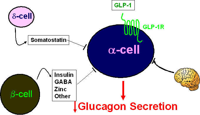 How does GLP-1 inhibit glucagon secretion from the islet a-cell? The precise mechanisms remain unclear but likely involve a combination of pathways including one or more b-cell-derived products, somatostatin from the d-cell, direct coupling of the a-cell GLP-1R (expressed in some but not all a-cells) to inhibition of secretion, and/or the involvement of neural signals as depicted below.